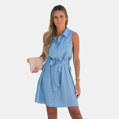 Looking for a dress that is both cute and versatile? Look no further than our Belted Sleeveless Shirt Dress! This woven mini dress features a classic collar, button-front closures, chest patch pockets, and a playful dolphin hem. Plus, the self-tie sash belt cinches in at the waist for a flattering silhouette. Perfect for any occasion, this dress is sure to become a staple in your wardrobe!Product code: CAA05A3D116SS/CAA05A3D116TTModel Wearing Size: SHeight: 5‘6″ in168 cmBust: 34 in86 cmWaist: 25 in63 cmHips: 30 in 76 cm