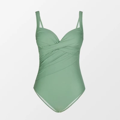 Add a playful touch to your swimwear style with our green solid ruched one piece swimsuit. The Wrap cross front design gives this one-piece swimsuit an eye-catching look. The scoop back detail lets you find your perfect fit with every wear. And you can easily remove the padding for customizable coverage.Product Code: ASL9081GAModel Wearing Size: SHeight: 5′ 5” in165 cmBust: 34 in86 cmWaist: 26 in66 cmHips: 37 in 94 cm
