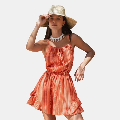 Step into summer with our Striped Tie Front Ruffled Romper, featuring a playful striped pattern and a flirty tie front detail, creating a chic and whimsical look that’s perfect for embracing sunny days and warm-weather fun.Product code: CAA13E3E053KCModel Wearing Size: SHeight: 5’6′ in168 cmBust: 33.1 in84 cmWaist: 25.2 in64 cmHips: 34.6 in 88 cm